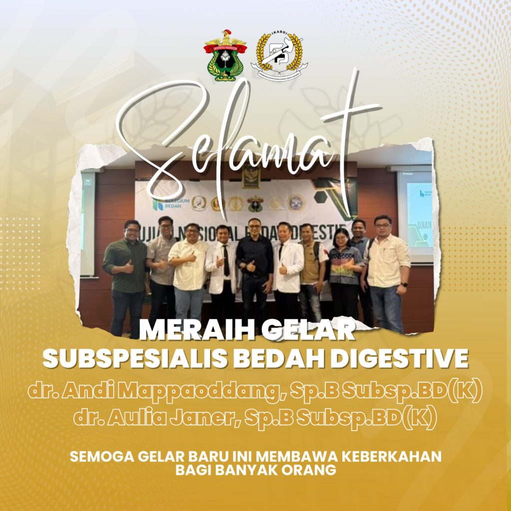 Selamat dan sukses kepada dr. Aulia Janer, Sp.B Subsp.BD (K) dan dr. Andi Mappaoddang Sp.B Subsp.BD (K) atas pencapaian luar biasa meraih gelar Subspesialis Bedah Digestif!